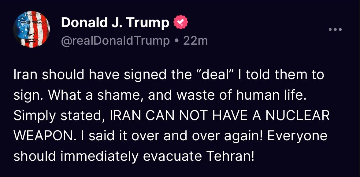 Trump publicó este lunes en su red social un mensaje pidiendo la evacuación inmediata de la capital iraní, Teherán.