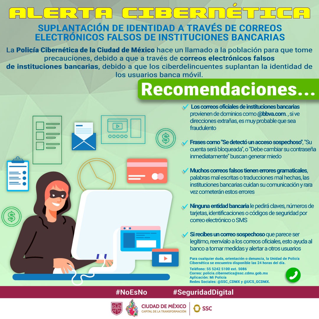 La Unidad de Policía Cibernética de la Secretaría de Seguridad Ciudadana (SSC) exhortó a la ciudadanía a tomar precauciones con los correos electrónicos falsos de instituciones bancarias, en los cuales, los ciberdelincuentes suplantan la identidad de los usuarios.