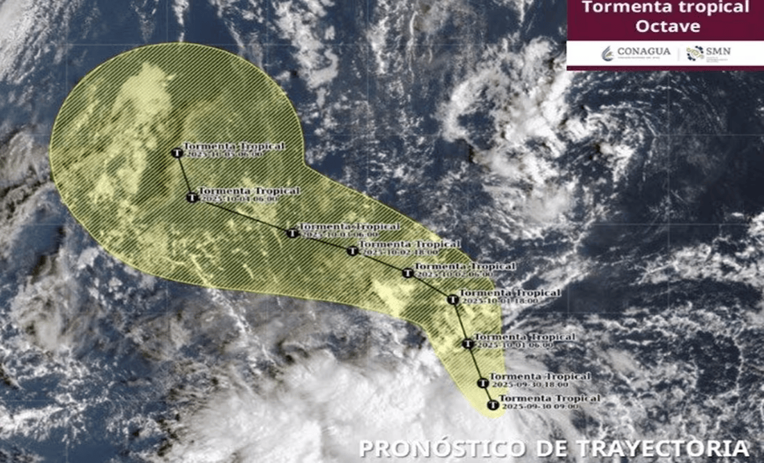 El Servicio Meteorológico Nacional (SMN) informó que la depresión tropical Quince-E evolucionó a Tormenta Tropical Octave. El fenómeno a las 09:00 horas, se ubicaba a mil 495 km al sur-suroeste de Cabo San Lucas, Baja California Sur. Presenta vientos sostenidos de 65 km/h, rachas de 85 km/h y avanza hacia el noroeste a 7 km/h.