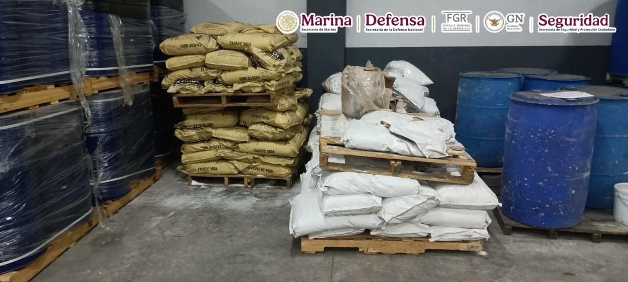 También se aseguraron 44 contenedores con 200 litros de metilamina cada uno, un estimado de 8 mil 800 litros de precursores químicos y material diverso para la elaboración de drogas sintéticas.