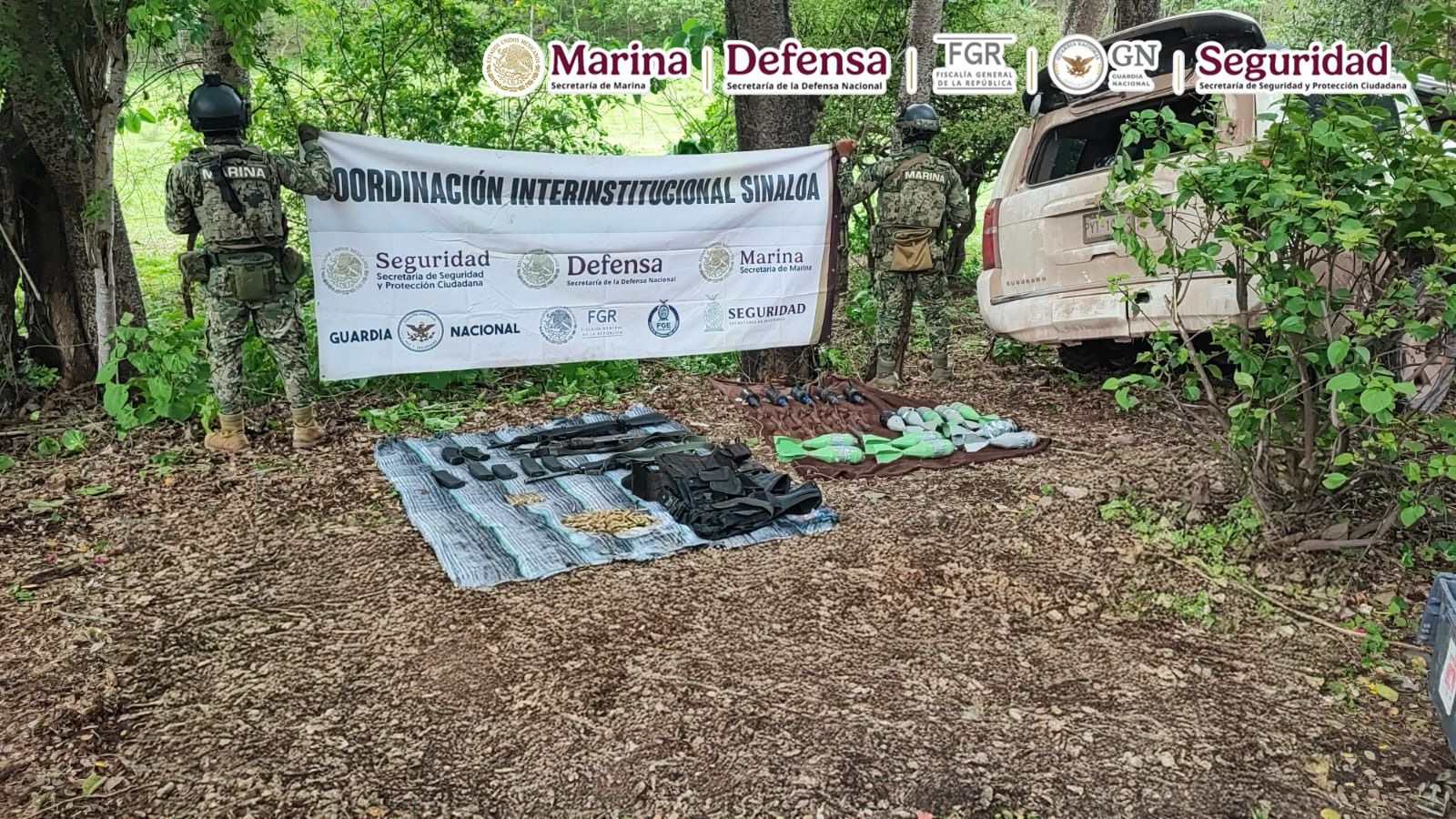 Resultado de los recorridos por tierra y aire en poblados de Sinaloa, encabezados por las secretarías de Marina y de Seguridad Federal, fueron asegurados varios vehículos, armamento, artefactos explosivos y equipo táctico, entre otros.