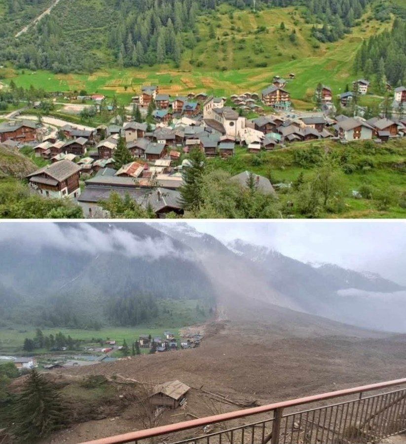 La tarde del miércoles 28 de mayo se produjo un derrumbe masivo del glaciar de Birch. Imágenes de drones difundidas por la cadena nacional suiza SRF mostraron una gran cantidad de barro y tierra que cubría por completo parte del pueblo, el río que lo atraviesa y las laderas boscosas del valle circundante.