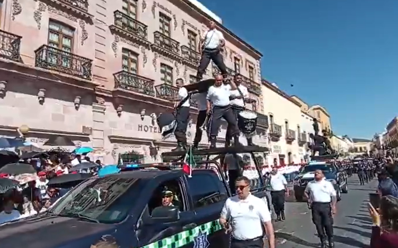 Cuatro de las víctimas permanecieron en la patrulla mientras que un elemento más cayó al adoquín de la calle. Elementos de seguridad que resguardaban el desfile se acercaron a auxiliar a su compañero.