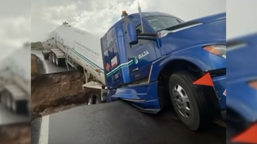 Una pipa de gas LP quedó suspendida sobre un tramo colapsado de la Carretera Transpeninsular, en el kilómetro 78 del municipio de Mulegé, Baja California Sur. El incidente es producto de un deslave provocado por las intensas lluvias de los remanentes de la tormenta tropical «Mario».