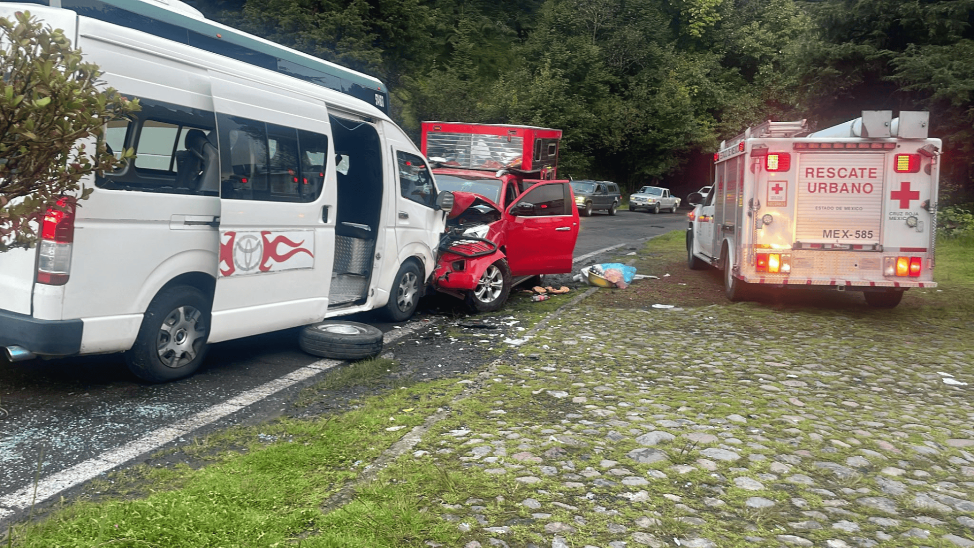 Una unidad de transporte público tipo combi se impactó contra una camioneta pickup a la altura de la comunidad de San Pedro Atlapulco, Ocoyoacac, Estado de México.