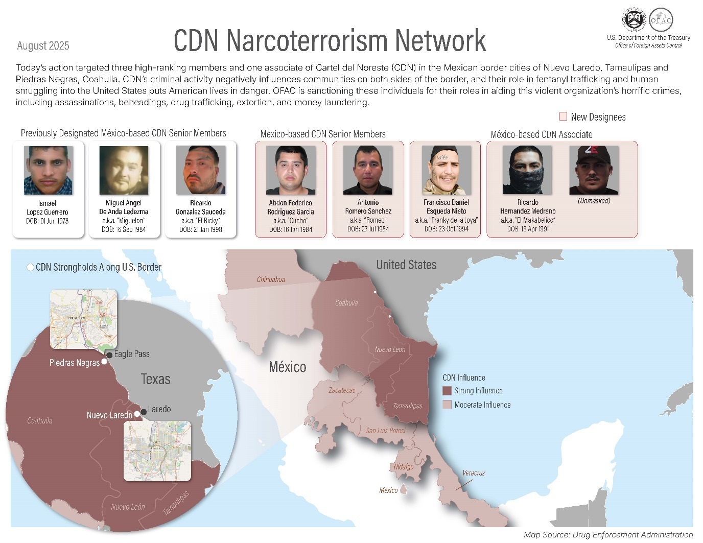 Los sujetos son miembros de alto rango del grupo criminal antes conocido como Los Zetas, mientras que el cantante participa en el lavado de dinero por medio de sus regalías en sitios digitales de música.