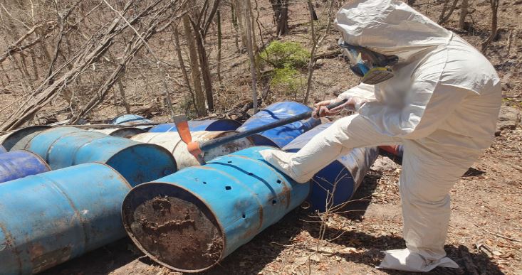 En Sinaloa, elementos del Ejército Mexicano inhabilitaron seis áreas de concentración de material diverso para la elaboración de metanfetamina, aseguraron 10 mil 130 litros y 450 kilos de sustancias para la elaboración de dicho estupefaciente y una mezcladora.