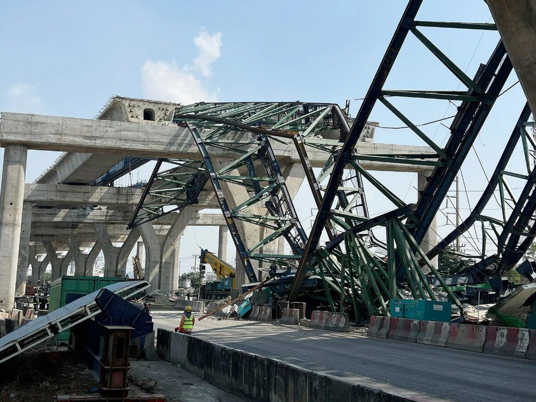 El accidente ocurrió durante la construcción de un puente elevado en la vía de Rama II, cuando la estructura metálica colapsó. Autoridades locales acudieron al lugar para acordonar la zona y evitar mayores riesgos.