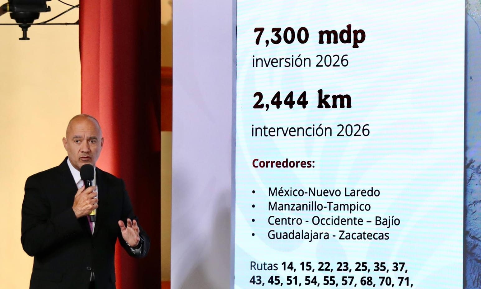 El titular de la Secretaría de Infraestructura, Comunicaciones y Transportes (SICT), Jesús Esteva Medina, presentó el Programa Nacional de Conservación de Carreteras y Bachetón 2026, que contempla una inversión de 50 mil millones de pesos (mdp) para intervenir 18 mil kilómetros de la Red Carretera Federal Libre de Peaje.