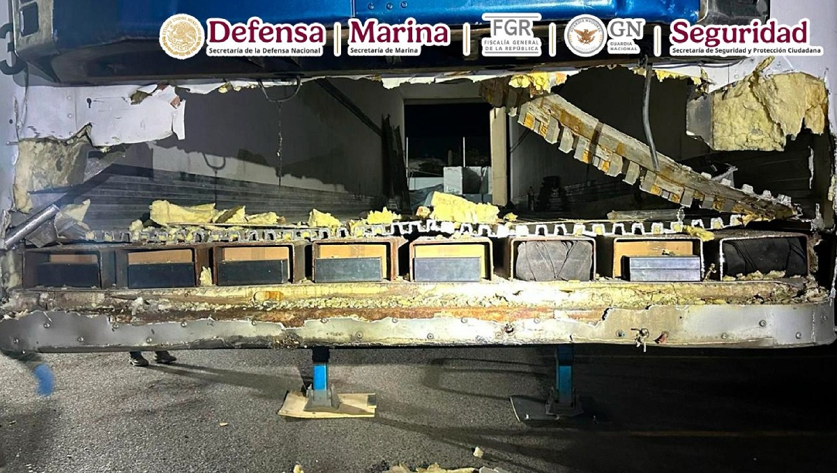 Luego efectuar la inspección detallada de la unidad y con apoyo de un ejemplar canino, se percataron que, en el piso de madera de la caja, se encontraban ocultas 575 cajas de cartón color café que contenían mil 100 kilos de metanfetamina.