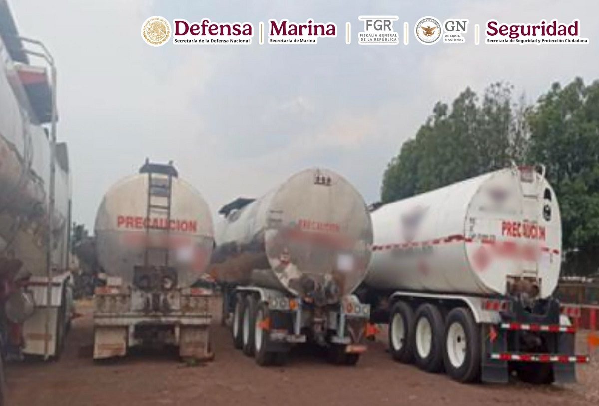 Resultado de estas acciones se detuvo a nueve hombres, se aseguraron dos armas de fuego cortas, un arma de fuego larga, diversos cartuchos, cuatro vehículos, cuatro motocicletas, siete tractocamiones, 11 semirremolques, 24 autotanques, dos bombas de trasvase, tres motores, 12 contenedores, aproximadamente 27 mil litros de asfalto y diversa documentación.