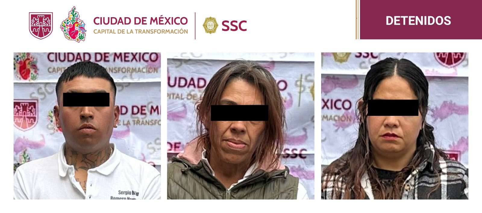 El titular de la SSC CDMX, Pablo Vázquez Camacho, informó en redes sociales que los detenidos son Jazmín “N”, Iraís “N” y Sergio Iván “N”, presuntos integrantes de una célula delictiva dedicada a este ilícito.