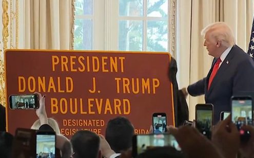 Este viernes, Donald Trump, en compañía de la representante estatal de Florida, Meg Weinberger, develó el nuevo cartel para la carretera de Palm Beach que ahora llevará el nombre “Presidente Donald J. Trump”.