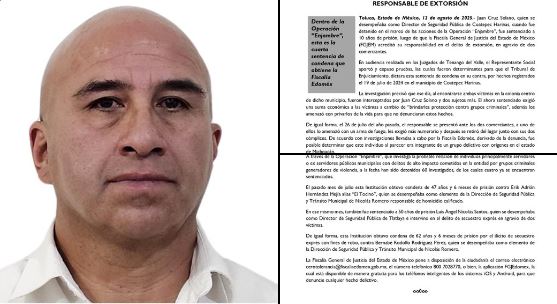 Juan Cruz Solano, quien se desempeñaba como director de Seguridad Pública del municipio de Coatepec Harinas, en el Estado de México, fue sentenciado a 10 años de prisión, luego de que la Fiscalía General de Justicia estatal acreditó su responsabilidad en el delito de extorsión, en agravio de dos comerciantes.