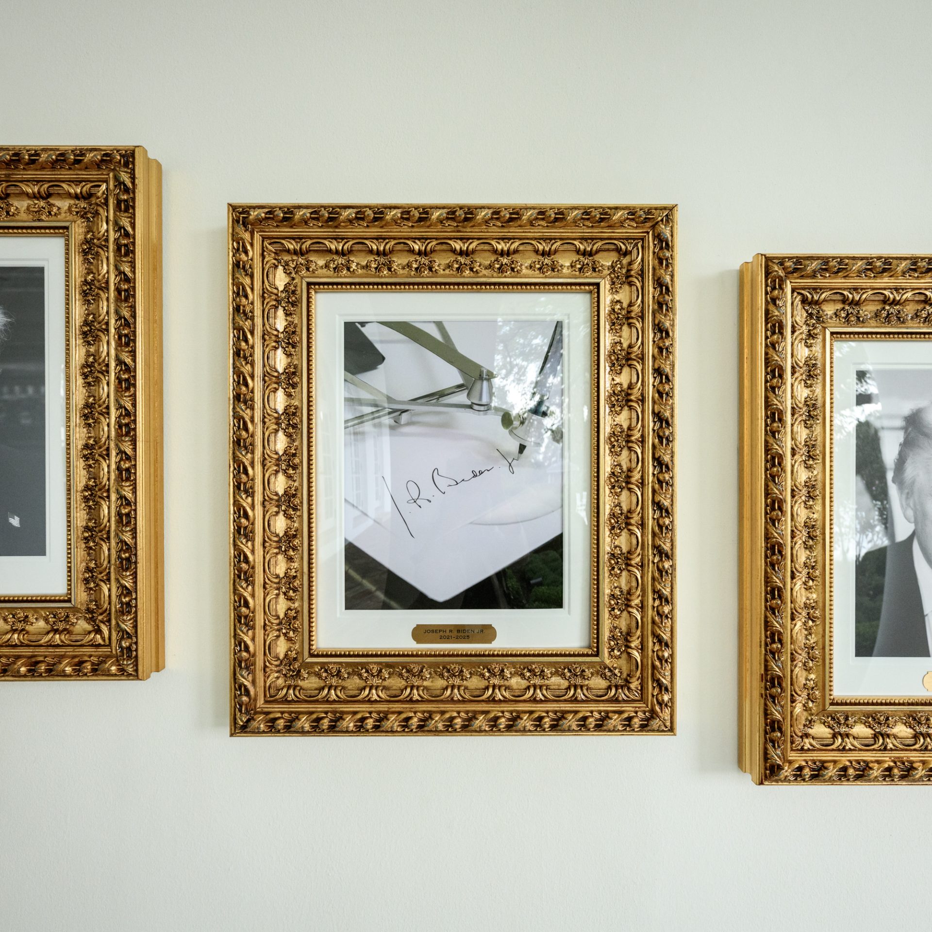El presidente de Estados Unidos, Donald Trump, ordenó colocar en la galería oficial de presidentes una imagen de una firma realizada con “pluma automática” en el espacio que correspondería al retrato de su antecesor, Joe Biden.