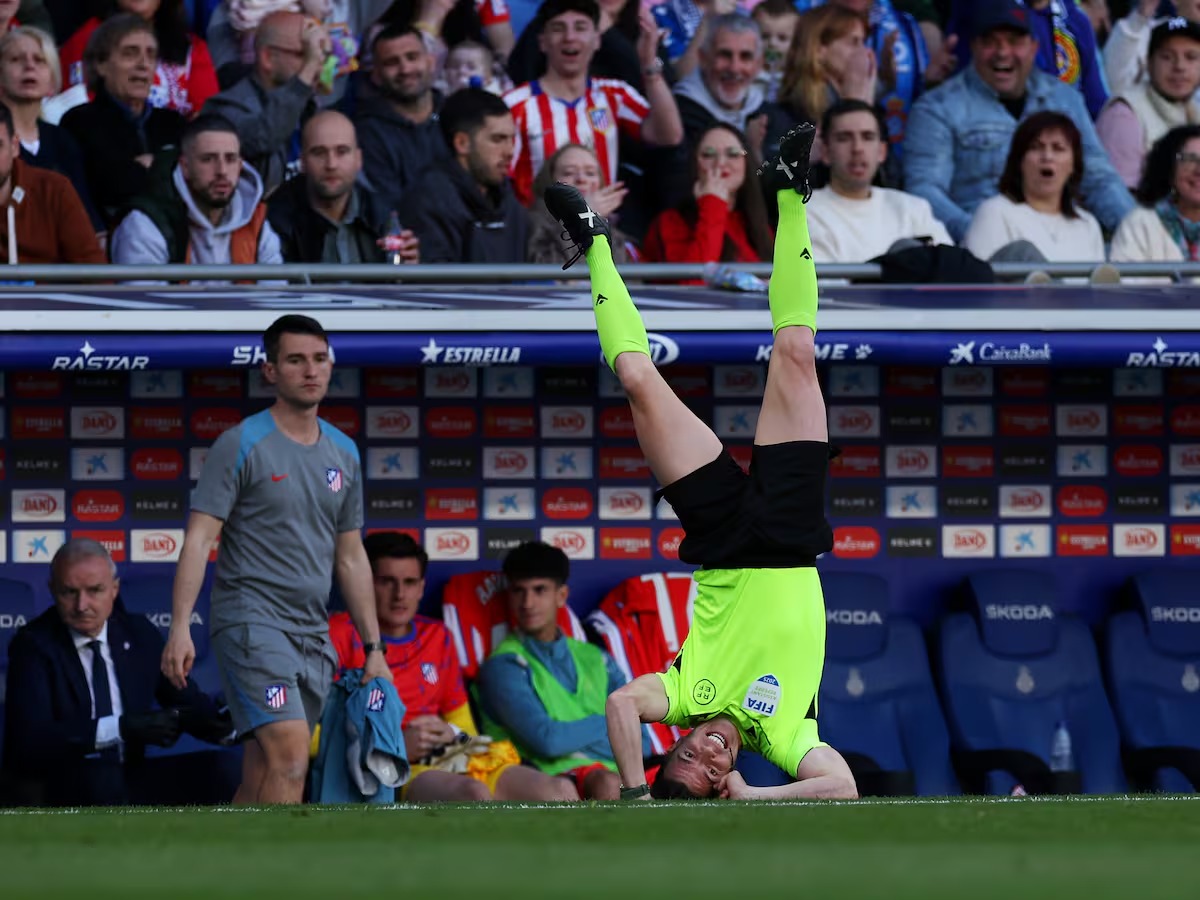 La jugada ocurrió cuando Giuliano Simeone, conocido por su entrega y velocidad en el campo, disputaba un balón por la banda derecha. En su intento por alcanzar el esférico, el delantero argentino colisionó accidentalmente con Rodríguez Moreno, quien, al intentar apartarse de la trayectoria de la jugada, terminó siendo derribado. Lo que siguió fue una imagen que rápidamente se viralizó: el árbitro asistente quedó momentáneamente con los pies en el aire y la cabeza tocando el césped, en una posición que recordó a una acrobacia fallida.