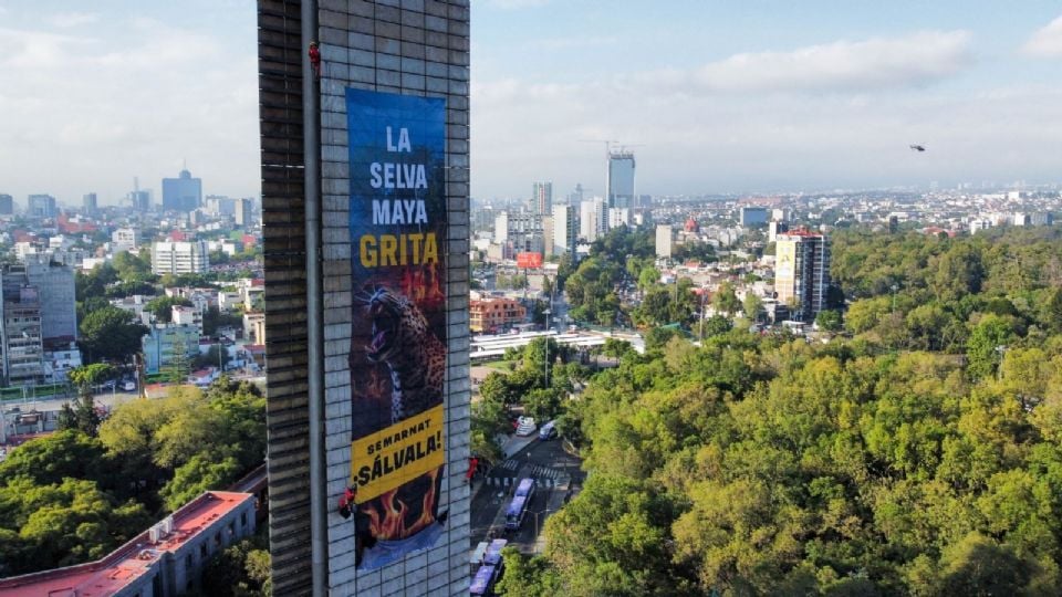 Activistas de Greenpeace México escalaron los 70 metros del monumento “Estela de Luz», en Ciudad de México, para desplegar una pancarta de 27 metros que reclamaba: “La Selva Maya Grita. Semarnat, ¡Sálvala!”.