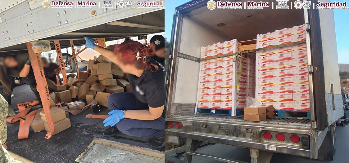 Lo anterior luego de una inspección en el Boulevard 2000 de la colonia Hacienda, en Tijuana, a un tractocamión acoplado a una caja refrigerada procedente de Sinaloa, que transportaba cajas con tomate; se hallaron modificaciones en la parte inferior que no correspondían con su estructura original. Ahí se localizaron los 564 paquetes de metanfetamina.