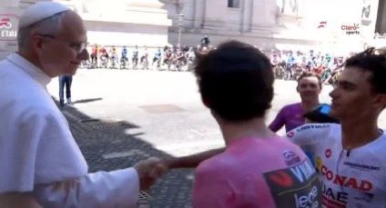 El pontífice, quien recibió una Maglia Rosa de manos de los organizadores, saludó a una pequeña comitiva de la caravana de ciclistas, entre los que estaban Simon Yates e Isaac del Toro, quien pudo estrechar la mano del Santo Padre.