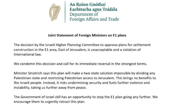 Los ministros de Exteriores de 21 países, entre ellos España, Francia y Reino, y la Unión Europea (UE), emitieron un comunicado conjunto en el que llaman al Gobierno de Israel a retractarse del proyecto que apunta a dividir a Cisjordania en dos, llamado E1, el cual califican como «inaceptable violación flagrante del derecho internacional».