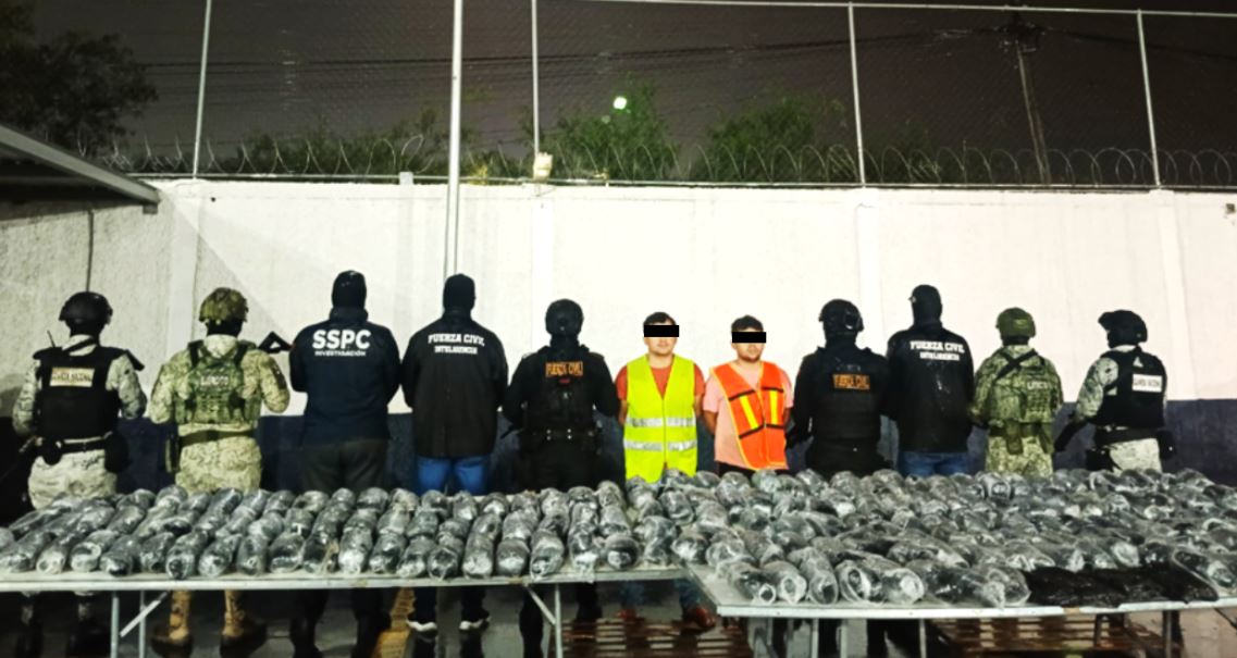 En Nuevo León, elementos federales capturaron a dos personas en General Escobedo, en posesión de 188 kilos de metanfetamina y dos vehículos.