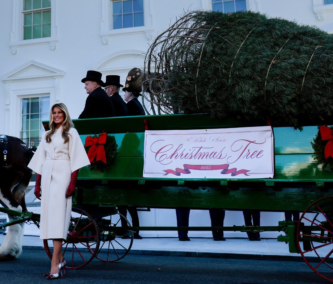 Melania Trump, vestida con un abrigo Christian Dior de color marfil, guantes de cuero rojo y zapatos de tacón a cuadro Manolo, agradeció a los trabajadores que llevaron el abeto y adelantó que comenzarán lo más pronto posible con la decoración de temporada.