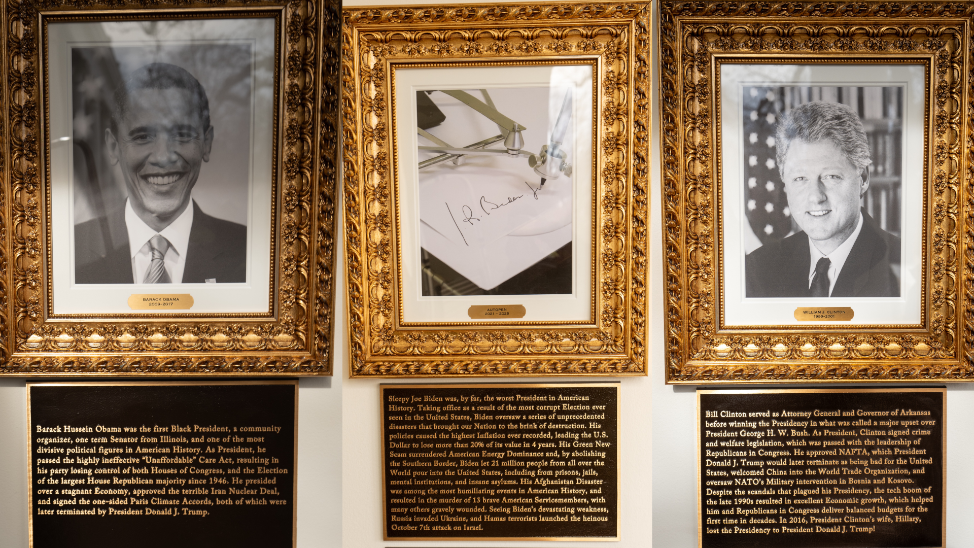 La placa dedicada a Joe Biden lo califica como “el peor presidente en la historia de Estados Unidos”. En lugar de un retrato, se exhibe la imagen de un bolígrafo automático, en alusión a la narrativa de Trump de que su antecesor no sabía lo que firmaba.