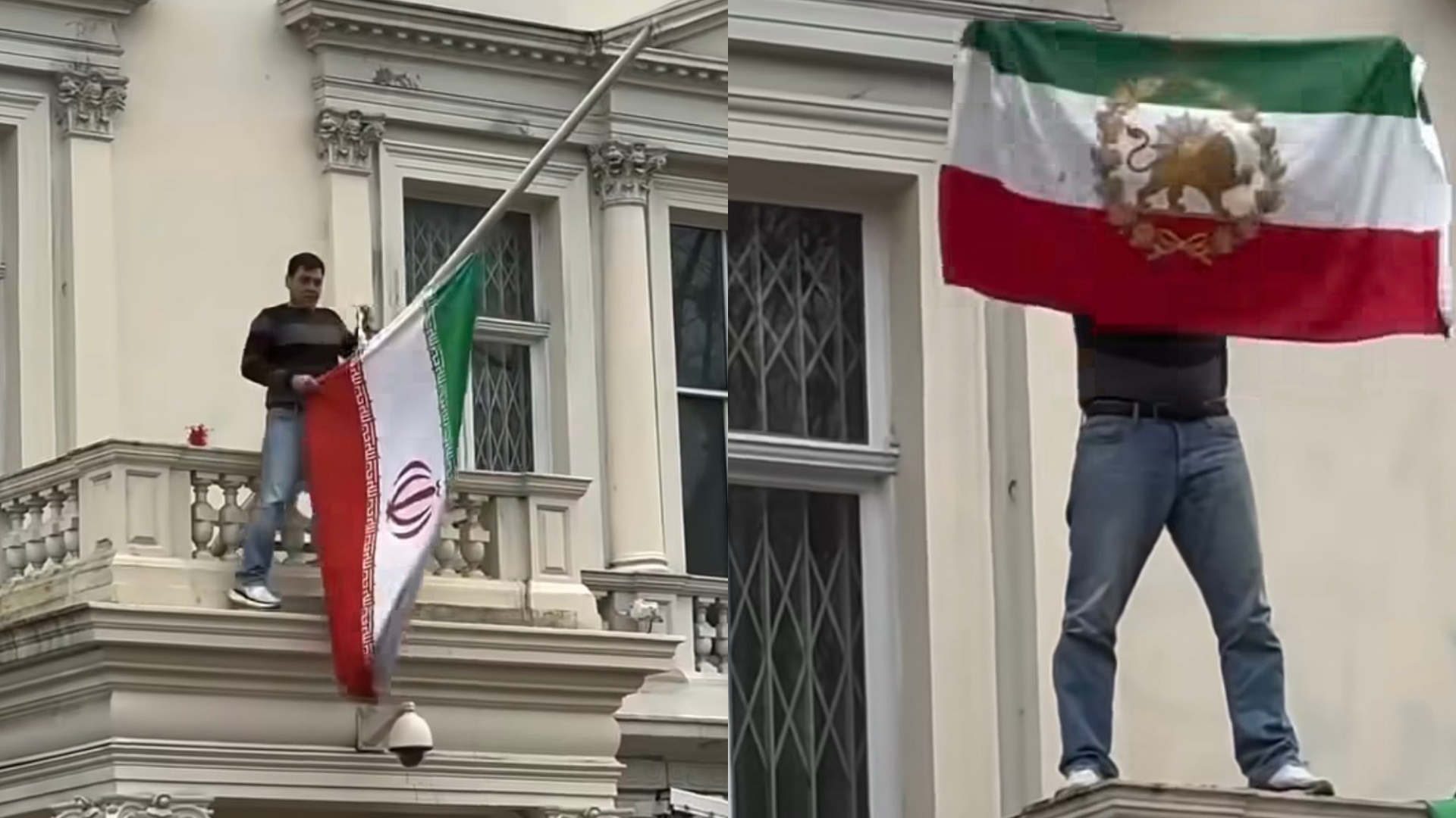 Imágenes difundidas en redes sociales muestran al manifestante en el balcón de la sede diplomática, ubicada cerca del Hyde Park, donde presuntamente retiró la bandera de la Revolución Islámica.