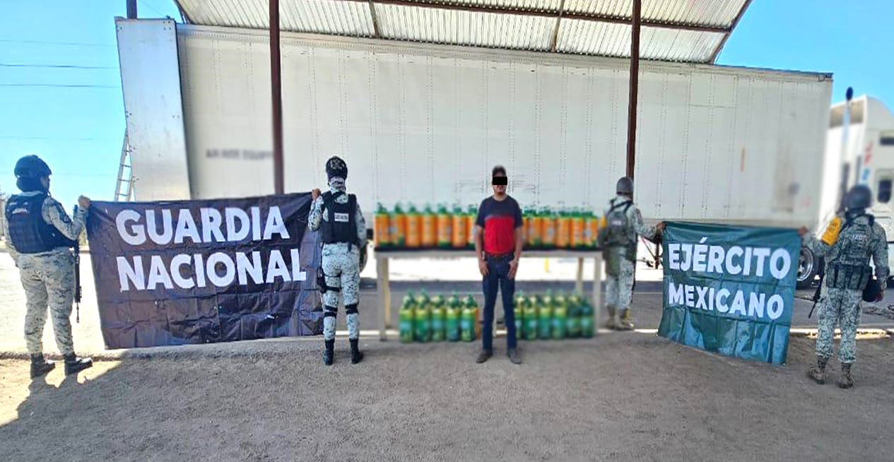 En Hermosillo, Sonora se detuvo a una persona, se aseguraron cuatro kilos de metanfetamina y un vehículo. Además, en San Luis Río Colorado, se aseguraron 1,062 litros de metanfetamina líquida y un vehículo.