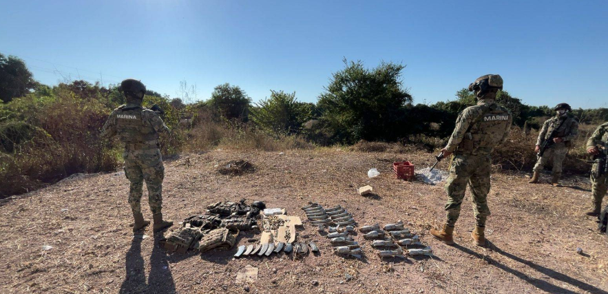 En Escuinapa, Sinaloa, se aseguraron 10 cargadores, 430 cartuchos útiles, 25 artefactos explosivos improvisados, cinco chalecos tácticos y un vehículo.