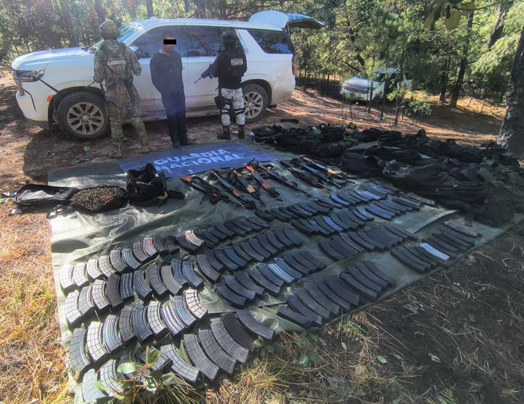 También en Chihuahua, pero en Guachochi, se detuvo a una persona, se aseguraron ocho armas largas, 142 cargadores, 2,300 cartuchos, 16 chalecos tácticos y dos vehículos.