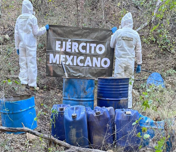 Otra acción en Cosalá, Sinaloa las autoridades localizaron e inhabilitaron cinco áreas de concentración de insumos para drogas sintéticas y se aseguraron 3,850 litros de sustancias químicas. La afectación económica estimada para el crimen organizado es de 76 millones de pesos.