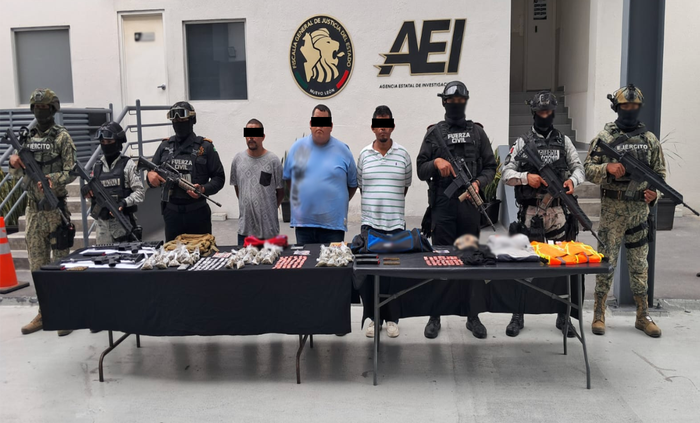 En Monterrey, se detuvo a tres personas, se aseguraron tres armas de fuego, tres cargadores, 27 cartuchos, tres chalecos tácticos y 23 estrellas ponchallantas.