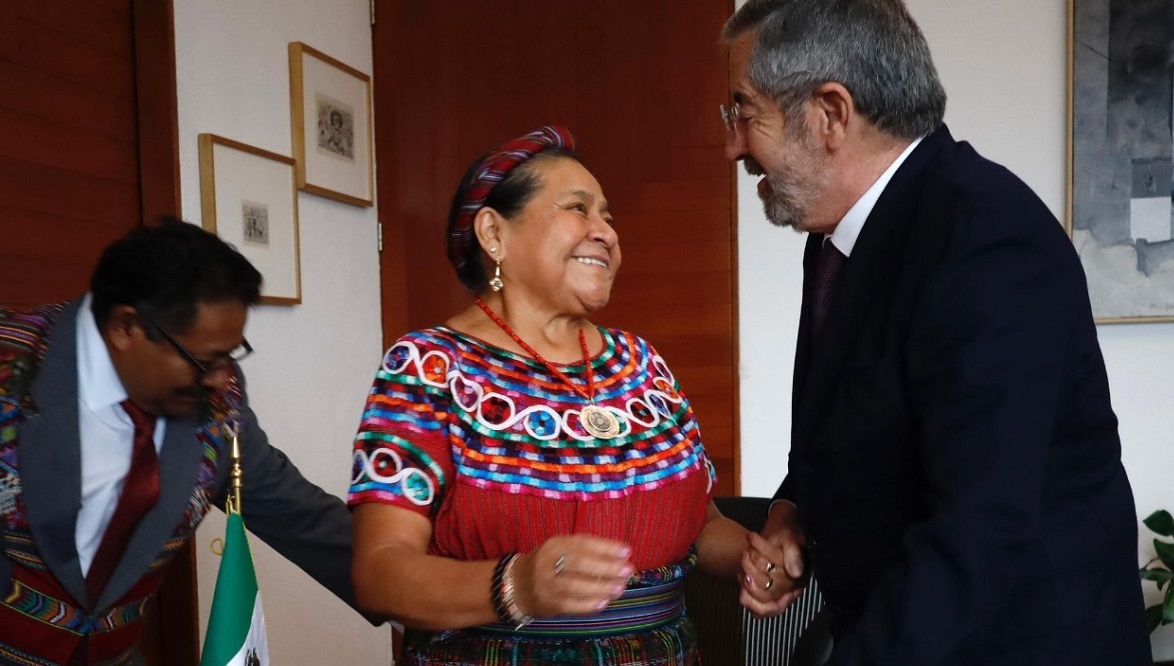 La Secretaría de Relaciones Exteriores informó que el canciller Juan Ramón de la Fuente entregó a Rigoberta Menchú, Premio Nobel de la Paz 1992, su carta de naturalización mexicana en representación de la presidenta Claudia Sheinbaum.