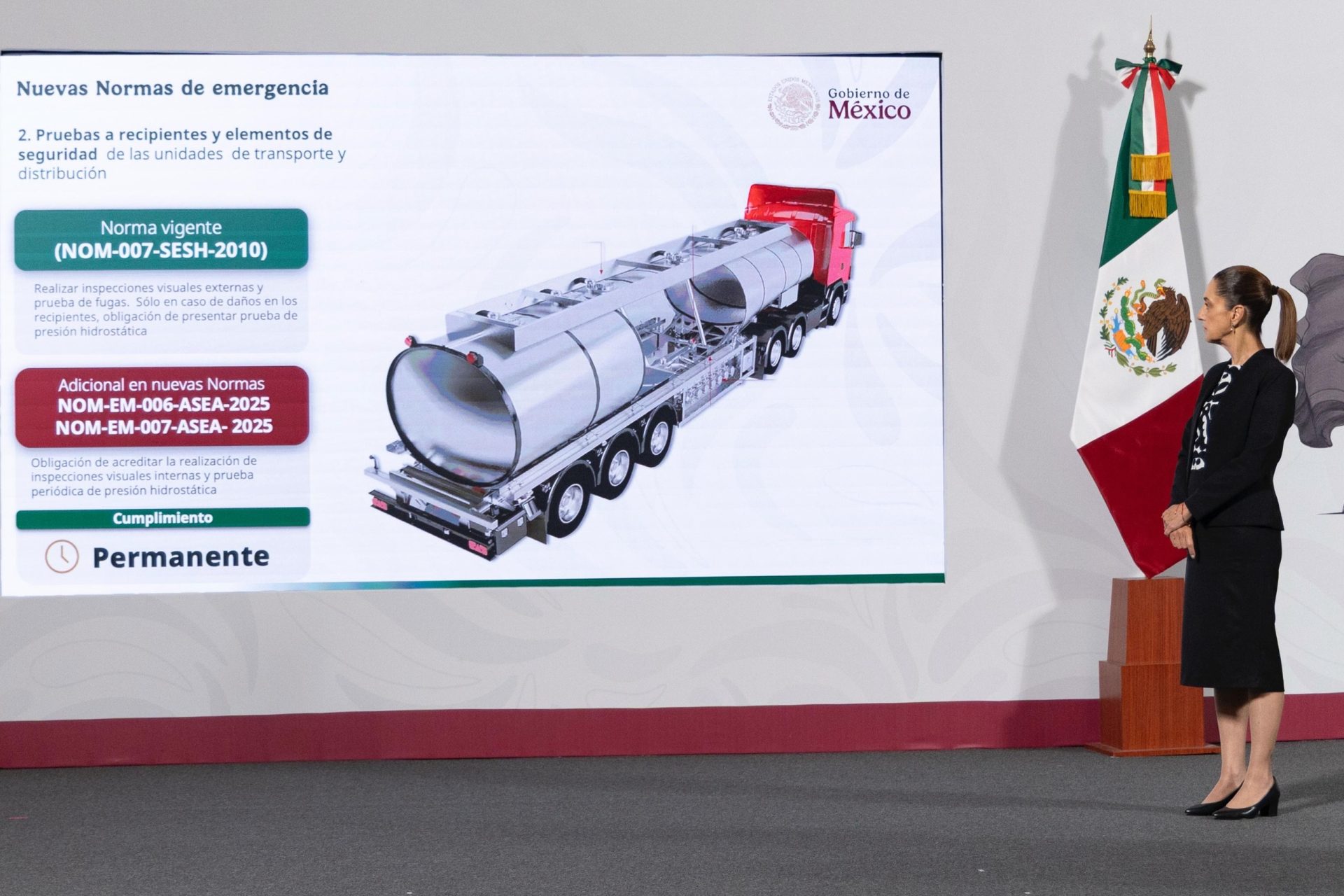 ”Las dos normas emergentes que vamos a emitir el día de mañana complementarán la regulación confiada en esta norma actual (Norma 007 CSH2 1010) y serán más específicas” (…) la que sí que vamos a fortalecer con estas dos normas, primero, el cumplimiento de los programas de mantenimiento de las unidades de transporte”_ explicó la secretaria de Energía, Luz Elena González Escobar.