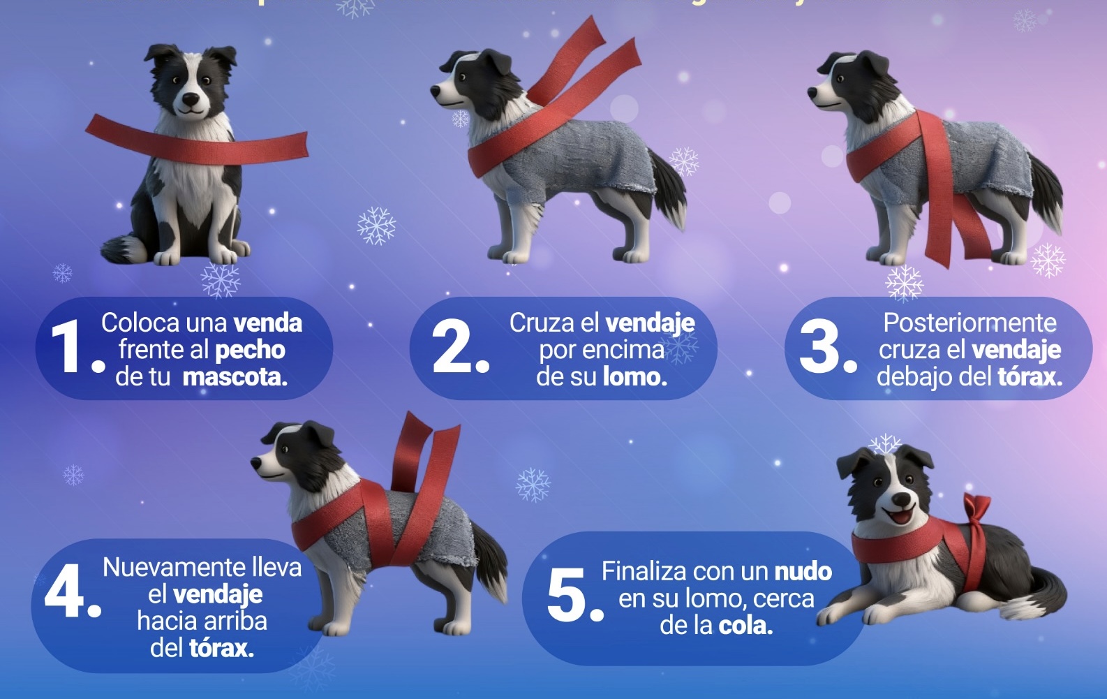 ¿Cómo colocarlo? Coloca una venda frente al pecho del perro. Cruza el vendaje por encima de su lomo. Posteriormente, cruza el vendaje por debajo del tórax. Lleva nuevamente el vendaje hacia la parte superior del tórax. Finaliza con un nudo sobre el lomo, cerca de la cola.