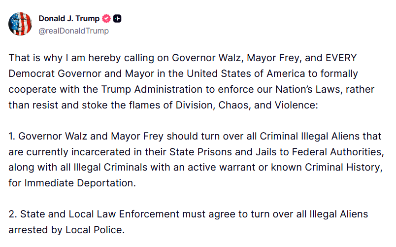 “El gobernador Walz y el alcalde Frey deben entregar a todos los extranjeros ilegales criminales que actualmente están encarcelados en sus prisiones estatales y cárceles a las autoridades federales”, escribió.