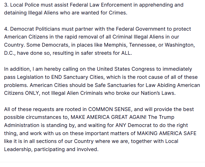 A través del mismo mensaje, el republicano aseguró que esta trabajando con el Congreso de los Estados Unidos para reprobar una legislación que ponga fin a las “ciudades santuario”, asegurando que las “ciudades estadounidenses deberían ser santuarios seguros solo para ciudadanos estadounidenses”.
