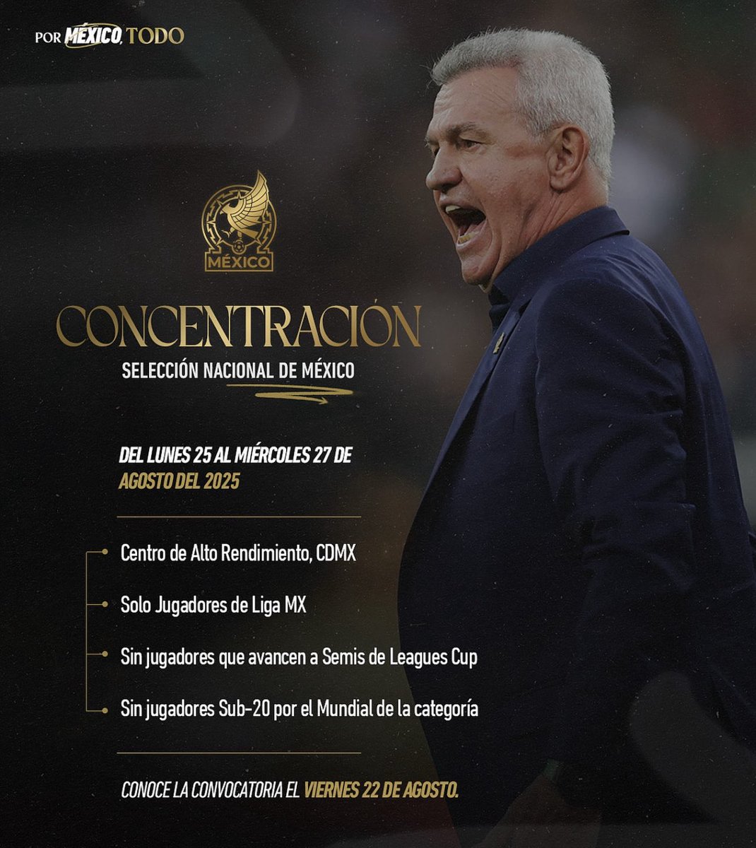 La concentración se realizará del 25 al 27 de agosto, según lo dio a conocer la Federación Mexicana de Futbol este lunes en redes sociales. El comunicado señaló que la lista de convocados será revelada el viernes 22, lo que mantiene la expectativa sobre qué jugadores podrán mostrarse.
